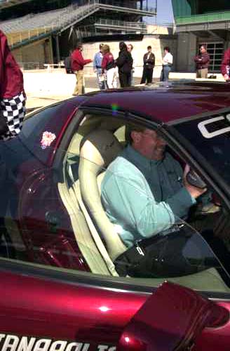 surroundings, Dan prepares to co-pilot the Pace Car for a lap