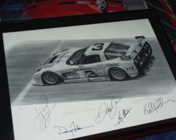 Original Paintings, a 50th Hood and front bumper, and racing memorabilia.. Andy Pilgriam's prize helmet from the 1997 to 2000 racing season, purchased by Walker Brower for $12,000.