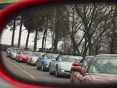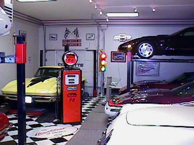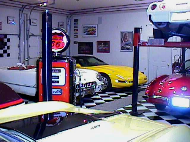 miles alone. What a pleasure. The unveiling of the 95 Pace Car was quite a reward for us. Our family has always enjoyed indy cars and the connection was an automatic smile. The 95 was so clean and sharp, they could have put a Blue Flame 6 in it again and I would like it just as well. We went to Bloomington and it was advertised how there would be a Pace Car offered at the auction. I made the arrangements so if another one of the "once in a life time" deals came along, I was ready. I passed up on the most fantastic sale of a blue 54 because I was interested in the Pace Car. After the 54 was gone I had that sick feeling, but I stuck to my game plan. The time came and the 95 Pace Car rolled into the area. The price went up quickly and was more than I thought it would be. Now I was really sick about the 54 we missed out on. We were back home for about two weeks and my wife wanted to go to a near by shopping area for some miscellaneous things. I dropped her off and said we were going to go to the Chevy dealership in that area who often had 6, 8 or 10 Vettes in their lot. When we got there, wouldn't you know it, they had two Pace Cars in their show room. I didn't know if it was going to be a stroke or a heart attack, but I was sure it would be one of them. A salesman came up and asked if we needed help. I told him I was interested in talking to someone on one of the Pace Cars. He said they were for sale but there was only one person who could discuss them. He would go to get the guy. The salesman was checking every 15 minutes to update me. After waiting for 45 minutes to an hour, the young man came out and said I am afraid the guy you need to talk to informed me he will not be able to talk to you at this time. If you leave your name and number, he will call you when he can discuss it. I left my name and etcetera. As I turned a heavy set businessman was casually strolling in front of the window, carrying his brief case and sucking on a giant cigar. This may or may not have been the guy I was waiting for, but it left that bitter impression. We scrambled to get back to my wife who was finished and standing at the curb. In fact this was her fourth time there, checking to see if we arrived yet. We shared our excitement and disappointment with her. Partly to share the experience but mostly to tone down the flared temper. As we drove on it occurred to call another dealership. Maybe the Pace Cars weren't as scarce as we thought. We talked to the sales man that sold us the 95 and 60. He did have one on the floor. I expressed I was interested but had just seen one and he had to get us his best deal up front. We were on the cellular phone and I gave him that number to call us back, assuming he would call within 15 to 20 minutes. The call never came. After the rejection at the other dealer and now at the one we had a relationship with, we were really getting depressed. Two days later, we were on the way to a Cleveland Indians game. The cellular phone rang and it was the salesman. He apologized for the delay but to get his best deal, he had to talk to one particular guy. He was finally there. He gave me the price. So I agreed to call him back with an answer. We talked and concluded the price he gave us was better than anything we had seen, based on all the calls, shopping and the experience at Bloomington. We decided what a price would be, for us to consider it a good deal. I called him back and gave him the price. I offered for him to call me back but he said to hold the line and he would try to get a quick answer. Two minutes later, he came back on and said it's a deal. The Pace Car became known as the car we bought on the way to the Indians game. Indians tickets were really hard to get and these were real close to third base, 11 rows up. It was real hard to sit there, but the seats were so special. Then it started to rain, well actually a sprinkle. That was it. Jumped in the car and drove an hour to see the Pace Car. Great day for a ball game. It presently has 350 miles on it. It was getting pretty obvious I had to build a garage to house my cars. My wife will tell you that the garage was built to hold all the pictures, signs, and trinkets. And maybe there would be a little extra room to keep the cars in. The plan was to build it 30 by 40 which was the largest Zoning would allow in our neighborhood. Then I would be able to keep the rest in the garage attached to the house. We were to start soon and we went to Bloomington. I had seen the lifts before but this time it tuned on the light. I figured that if I raised the roof two feet, I could keep up to twelve cars in a six car garage. That was the solution. I came home and changed the lumber order right away. The mason was working on the footing while we were away, so this was at the minimum of opportunity. We were finally drawing near being done. It was costing me so much having the cars stored everywhere and not to mention the worry. Not necessarily worry of theft as much as the damage mice could cause. Those little critters were the real fear. The drive way was not done yet and I put in a vinyl checker board floor. So I was fearful of destroying the floor if I got gravel cinders in the vinyl. Now is when we could have won on Funniest Home Videos. We took twelve feet long boxes and drove the car on them. Put another pair down and drove forward again. Moved the back and kept going that way. I didn't think it went too bad because I was driving the car. But my son, wife and father-in-law were sure doing some scrambling. They did a great job and we never got a mud spot on a tire. I got to say I am glad Zoning didn't make the restriction any less. I never would have had enough room for my pictures and signs. I had never been to the National Corvette Museum. My son and I decided to fly to Nashville and rent a car to go to the Museum and tour the plant. The last year of the C4 and I heard of how the Corvette plant was going to change the way the assembly line w